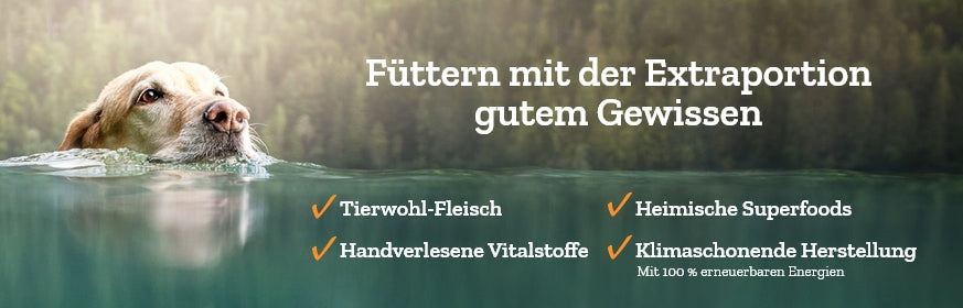 Unser Ziel ist es, jedem Hund ein langes, gesundes und glückliches Tierleben zu ermöglichen. Ohne Kompromisse. Dabei achten wir darauf, dass unsere gesunde, hochwertige Tiernahrung nicht zu Lasten der Umwelt, des Tierwohls und der Ethik geht. Wir übernehmen Verantwortung für die Natur und zukünftige Generationen und verfolgen daher als erste deutsche Tiernahrungsmarke einen ethischen Ansatz, der eine verantwortungsvolle Ernährung, mehr Tierwohl, Regionalität, Umwelt- & Klimaschutz sowie soziales Engagement vereint.