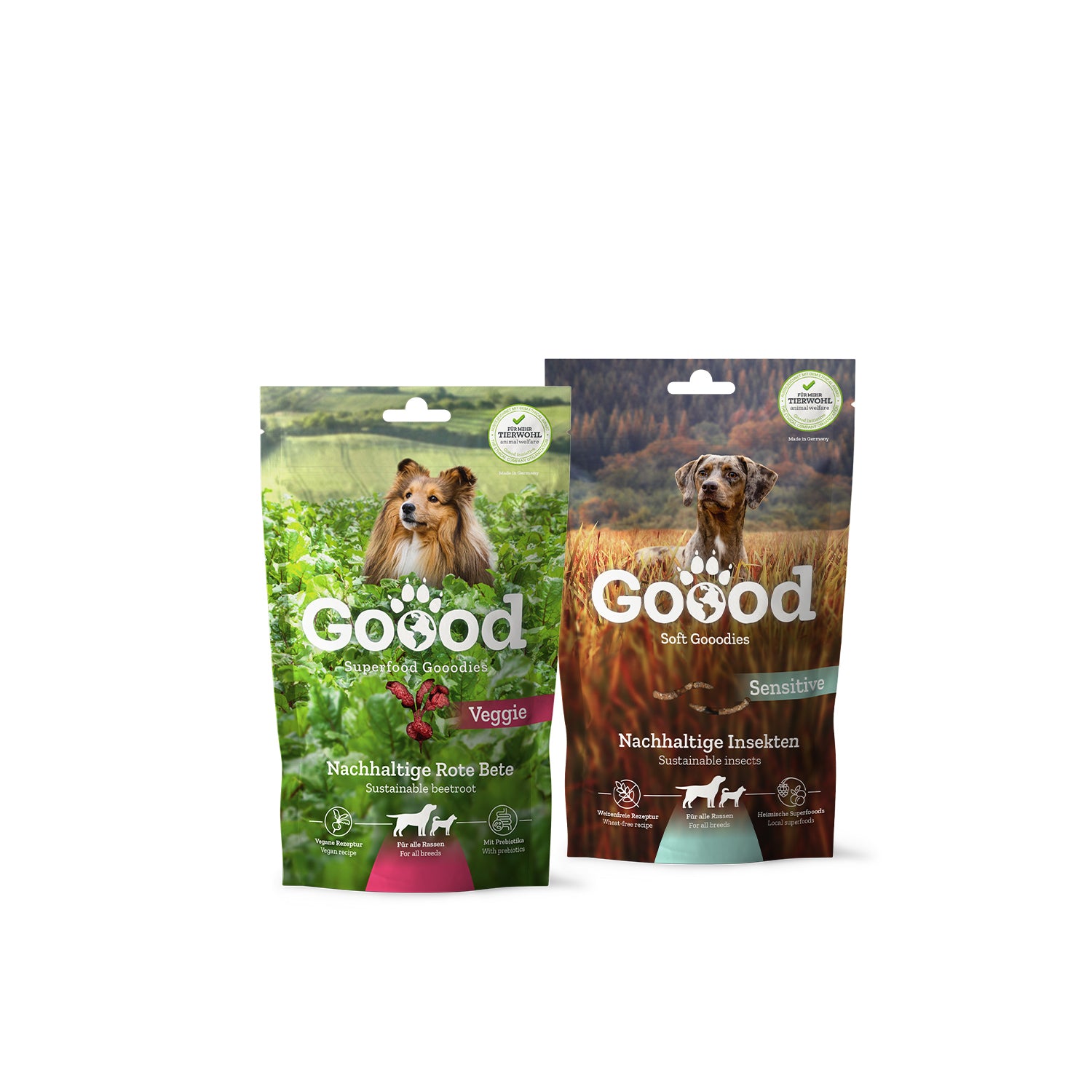 Goood Premium-Hundefutter gibt es für jedes Alter und verschiedene Größen. Da ist auch für deinen Liebling was dabei, versprochen. Die natürlichen Zutaten werden sorgsam zu einer leckeren Hundemahlzeit verarbeitet und anschließend weitestgehend recycelbar verpackt. Goood ist klimafreundlich und mit jedem Kilo unterstützt du soziale und nachhaltige Projekte weltweit. So tust du nicht nur deinem Hund etwas Gutes, sondern auch unserem Planeten.