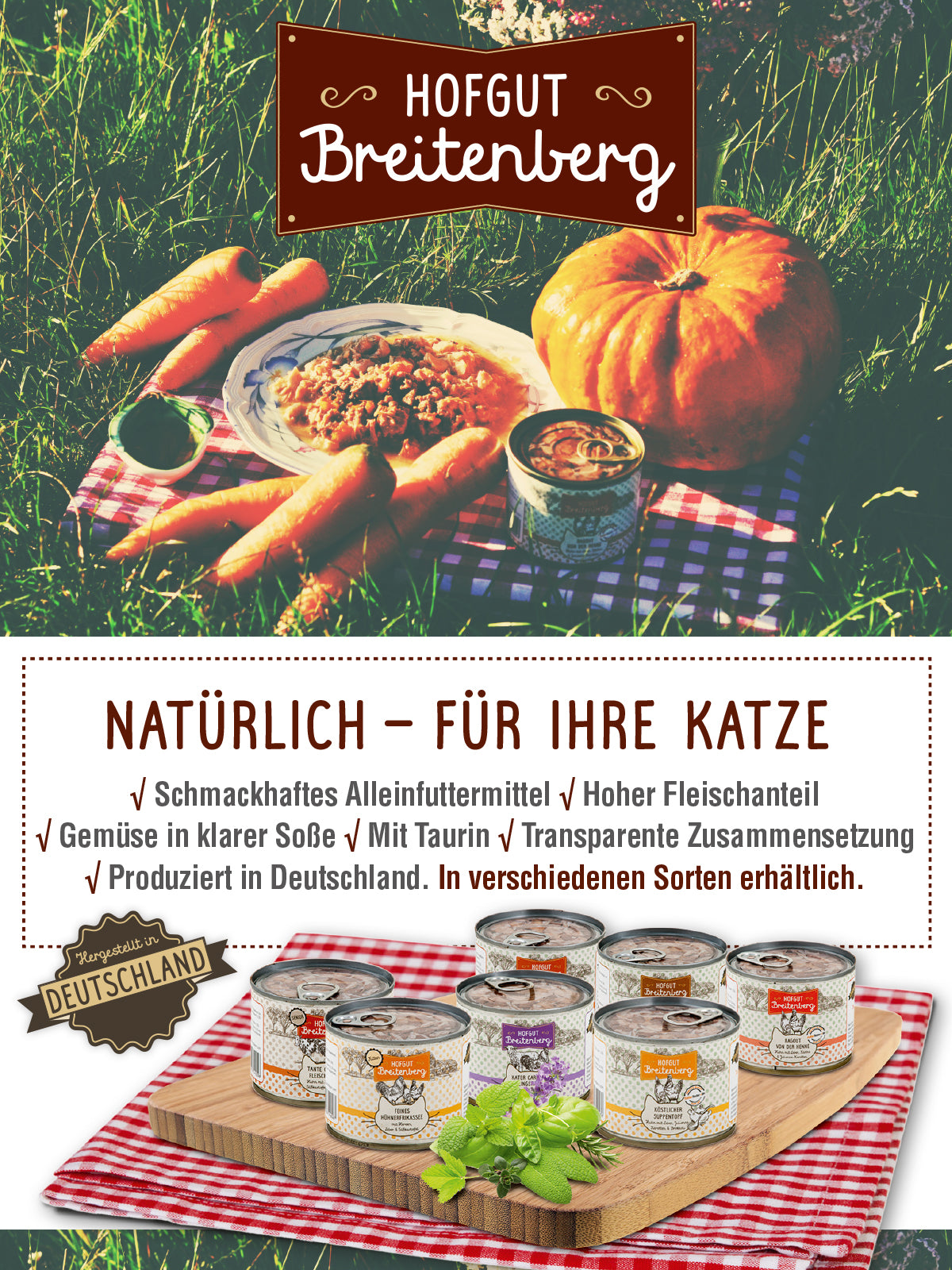 Ländliche Natürlichkeit, Zuverlässigkeit und Ursprünglichkeit – dafür steht die Premiumnahrung für Katzen von Hofgut Breitenberg. Hergestellt in Deutschland, vereint unser Futter traditionelle Werte mit hochwertiger Qualität, um Ihren Katzen ein gesundes und geschmackvolles Fresserlebnis zu bieten.