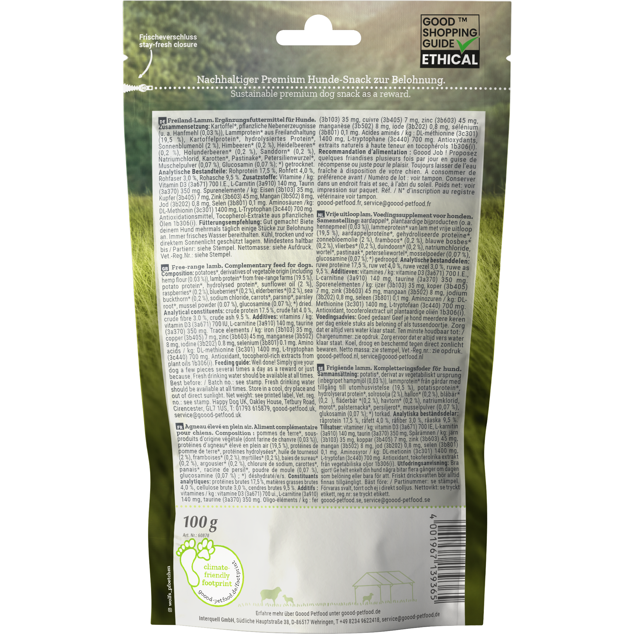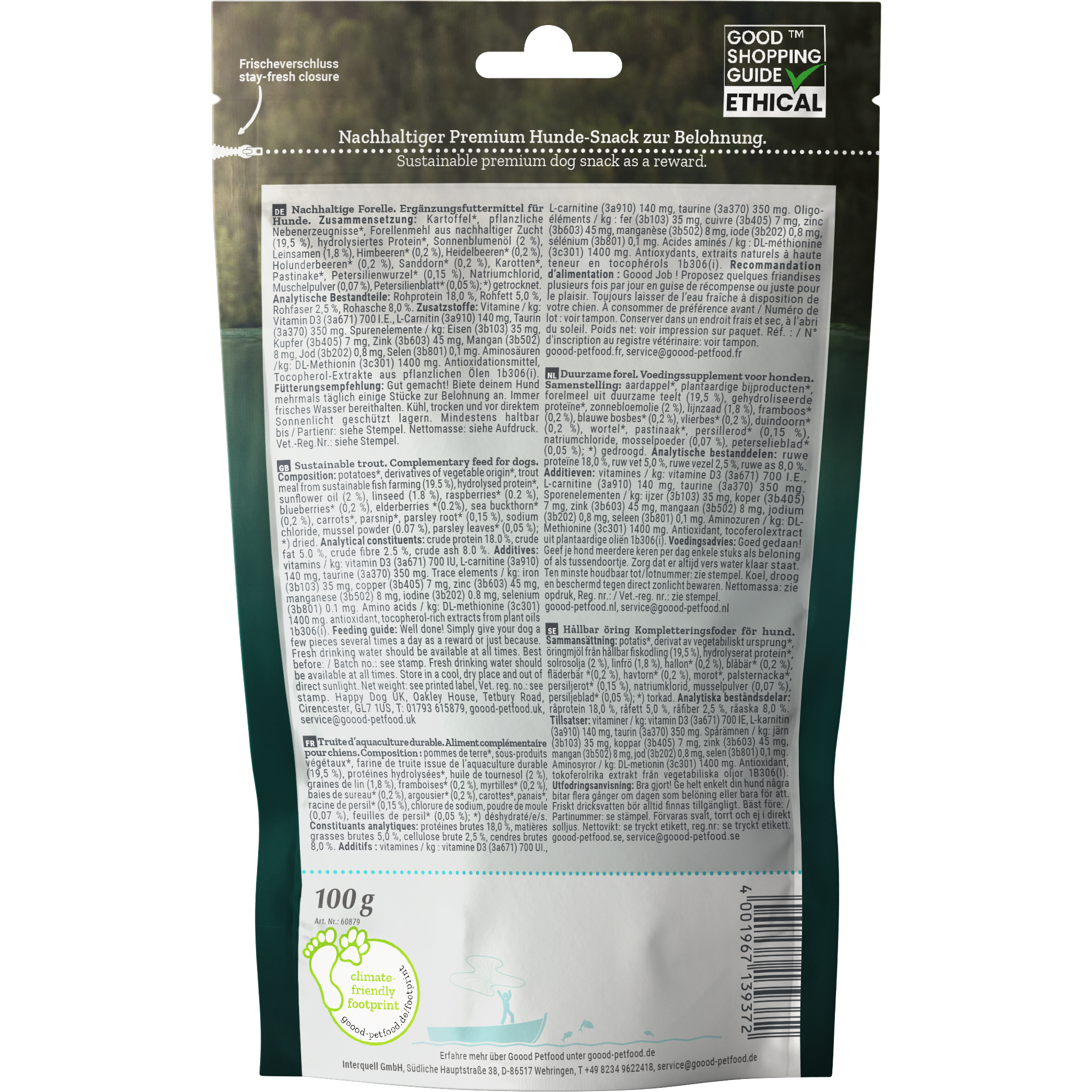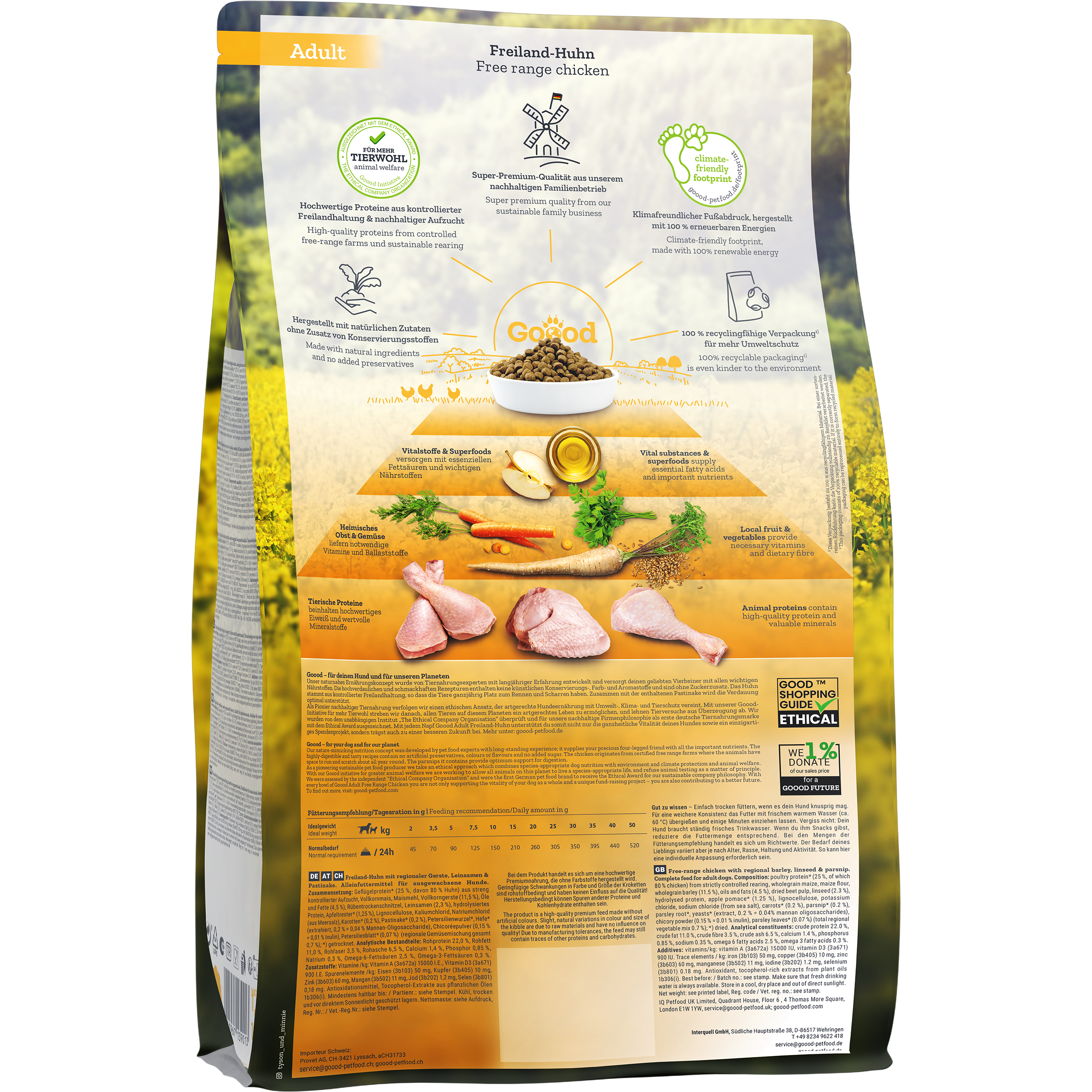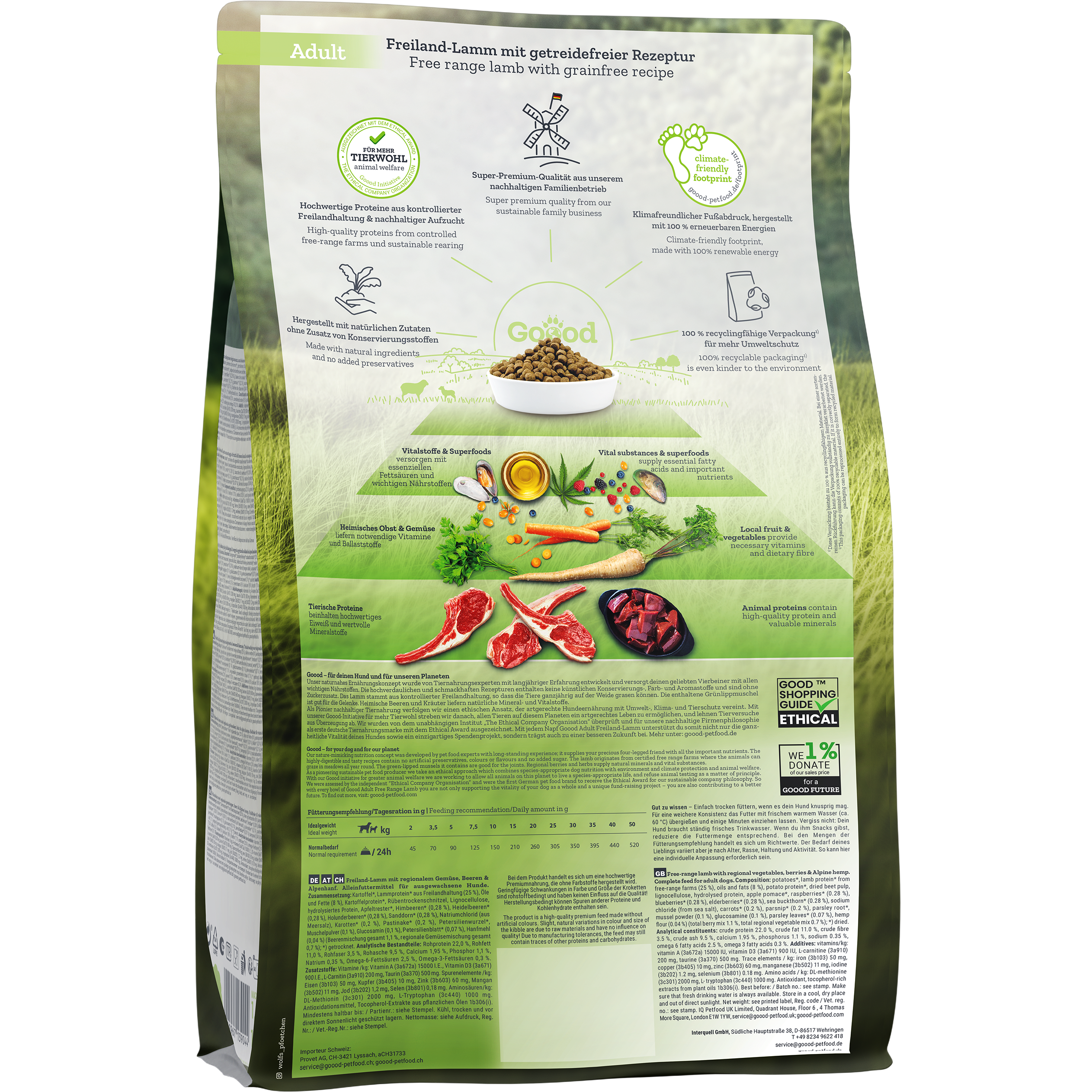 Die nachhaltige Produktion von Premiumhundefutter steht bei Marke Goood an erster Stelle, weshalb der Hersteller auch den Ethical Award gewonnen hat. Er erfüllt viele Merkmale, die einer nachhaltigen Produktion entsprechen: Goood verwendet hochwertiges Fleisch aus Freilandhaltung und einen hohen Anteil an regionalen Zutaten. Der Familienbetrieb achtet mit seinem 100% klimaneutralen Futter darauf, seinen ökologischen Fußabdruck klein zu halten. Auch die Verpackungen werden überwiegend aus nachwachsenden Rohstoffen hergestellt. Mit jedem verkauften Produkt spendet Goood an gemeinnützige Organisationen im Bereich Umwelt-, Klima-, Arten-, und Tierschutz und soziales Engagement.