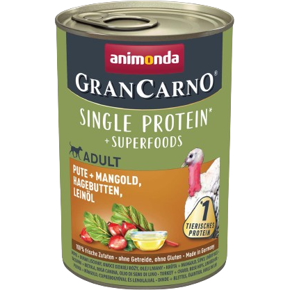 GranCarno® Superfoods steht für ausgewogene, leckere, gesunde Ernährung mit natürlichen Superfoods und nur einer tierischen Proteinquelle für ausgewachsene Hunde von 1 - 6 Jahren. Superfoods besitzen ein Plus an besonderen Nährstoffen, z. B. sekundäre Pflanzenstoffe, Antioxidantien, Mineralstoffe oder Spurenelemente und können so zum Wohlbefinden des Hundes beitragen. Die ausgewählten, frischen fleischlichen Rohstoffe garantieren den unvergleichlichen Geschmack, den Hunde so sehr schätzen. GranCarno Superfoods wird ohne Getreide, Soja, Zucker, Geschmacksverstärker, künstliche Farb- und Konservierungsstoffe in Deutschland hergestellt. Es versorgt den ausgewachsenen Hund mit allen lebenswichtigen Nährstoffen.