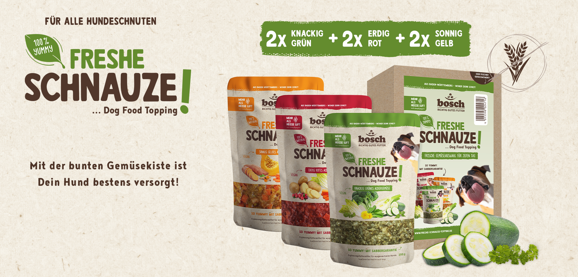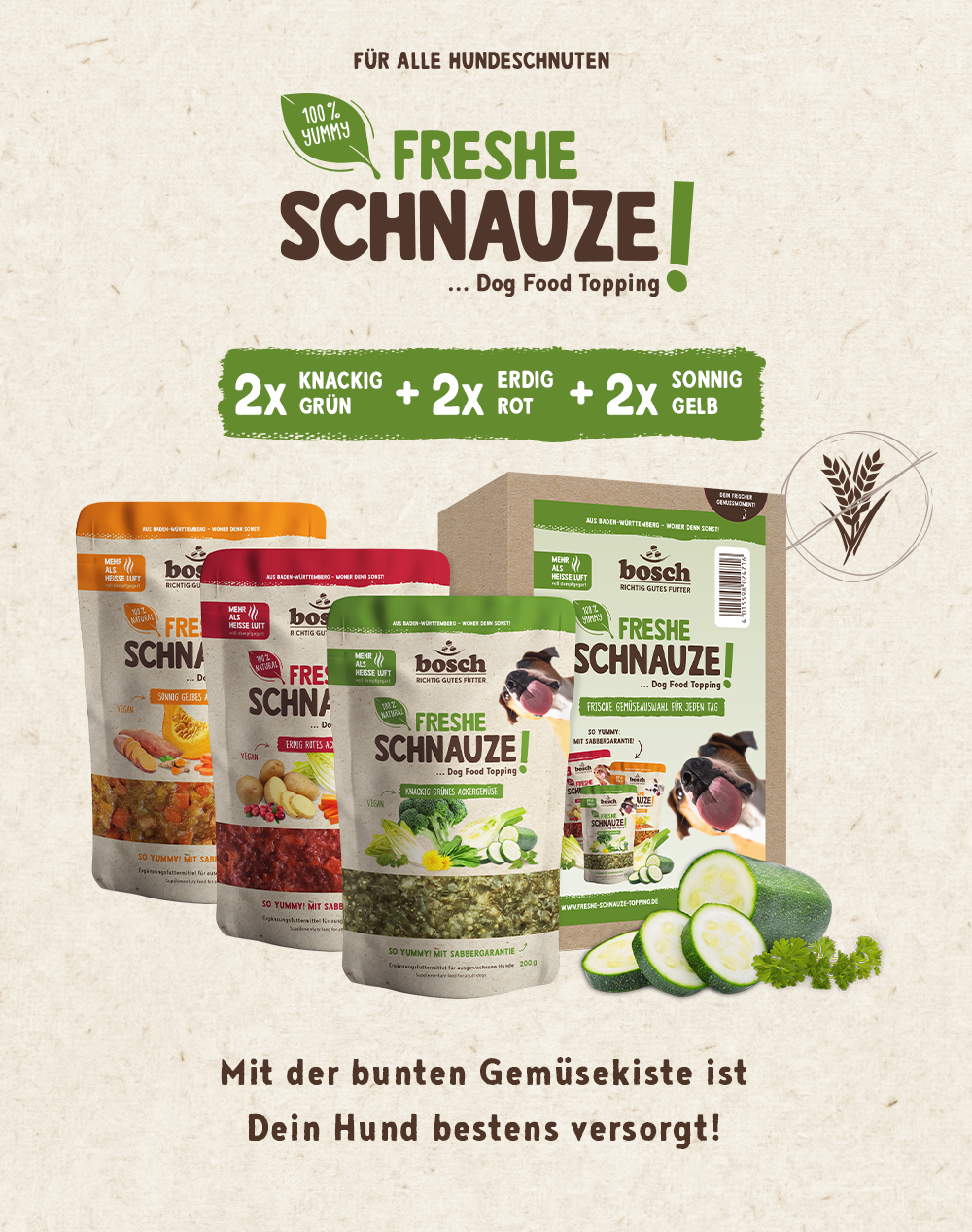 Die exklusiven Hundefutter-Toppings Freshe Schnauze sind das Genuss-Highlight in jedem Hundenapf. Eine erlesene Auswahl an knackigem Ackergemüse und fruchtigem Obst ergänzen das tägliche Alleinfutter deines Hundes. Egal ob Trockenfutter, Nassfutter oder BARF, mit diesem Ergänzungsfutter peppst du jede Hundemahlzeit auf.