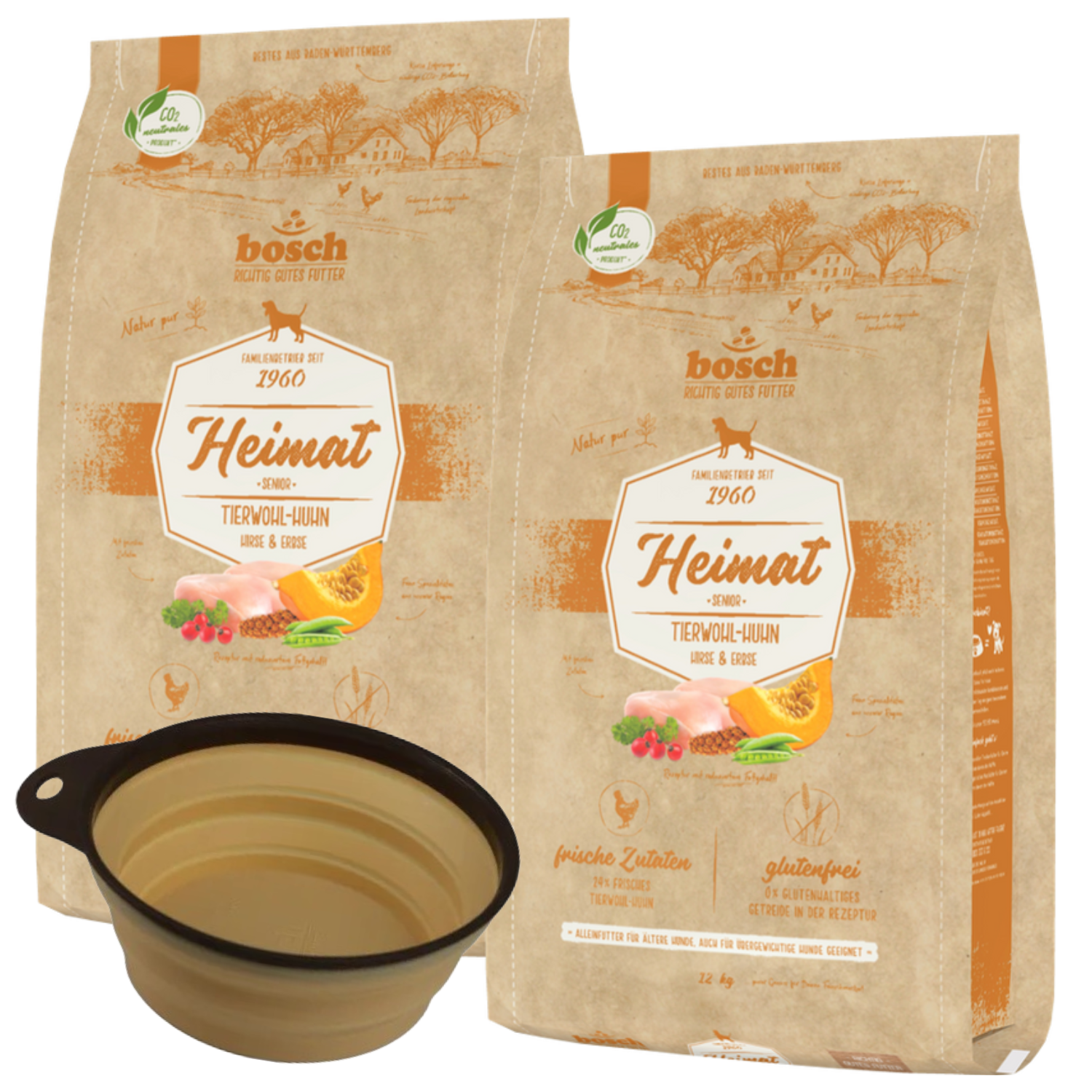Tierwohl-Huhn unterliegt speziellen Kriterien, die von Experten entwickelt wurden. So hat das einzelne Tierwohl-Huhn mehr Lebensraum zur Verfügung und zusätzlich organisches, veränderbares und sich verbrauchendes Beschäftigungsmaterial, wie z. B. Stroh, Heu oder Picksteine. Abgerundet wird dieses köstliche Schlemmer-Menü für ältere Hunde durch hochwertige Zutaten wie leicht verdaulicher Hirse, ballaststoffreichen Kürbis, proteinreichen Erbsen, wertvollem Lachsöl welches wir selbst herstellen und Hagebutten, die antioxidativ wirkende Pflanzenstoffe enthalten. Um Lieferketten zu verkürzen und Ressourcen zu schonen, erhält bosch den in der Rezeptur verwendeten Kürbis von einem Landwirt aus der Nachbargemeinde Schrozberg und bezieht die frischen Erbsen u. a. aus dem kleinen Ort Naicha (Vertragsanbau), der nur wenige Kilometer vom Firmenstandort entfernt ist. Durch den bewussten Verzicht auf glutenhaltiges Getreide in der Rezeptur und der Verwendung hochwertiger und leicht verdaulicher Kohlenhydratquellen ernährst Du Deinen Hundesenior besonders schonend und glutenfrei.