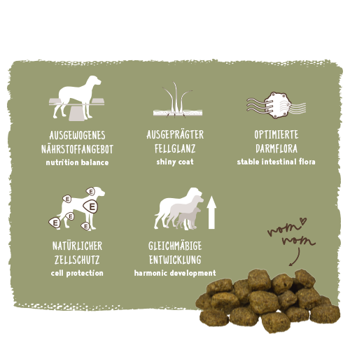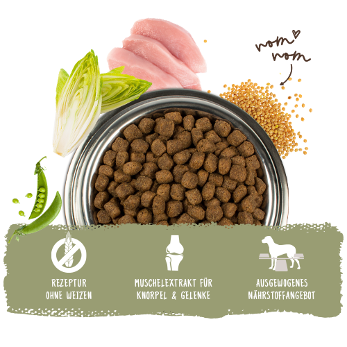 Die Energie- & Proteinkonzentration ist so gewählt, dass in Verbindung mit den enthaltenen Muschelextrakten den Risiken von Übergewicht für Knochen und Gelenke vorgebeugt wird. Durch den Einsatz eines Immun-Komplexes aus Mannanen & Glucanen wird die Darmflora stabilisiert, sowie das Immunsystem gestärkt. Unser Adult mit frischem Geflügel & Hirse eignet sich ebenfalls für ernährungssensible Hunde.