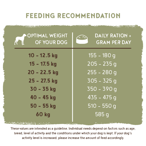 Der individuelle Bedarf hängt von Faktoren wie Alter, Rasse, Aktivität und Haltungsbedingung ab. Bei gesteigerter Aktivität bitte Futtermenge entsprechend erhöhen. Bitte stets frisches Wasser bereitstellen.