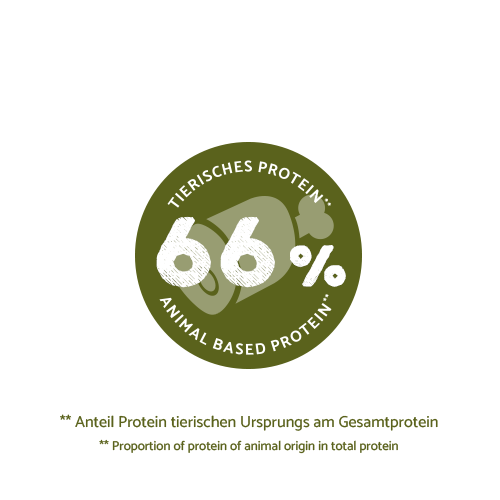 Frisches Geflügel (30 %), Hirse (17,5 %), Gerste, Mais, Geflügelprotein (getrocknet), Reis, Proteinhydrolysat, Rübentrockenschnitzel (entzuckert), Fischmehl, Geflügelfett, Erbsen (getrocknet), Hefe (getrocknet, 0,1 % Mannanoligosaccharide, 0,06 % Beta-Glucane), Fischöl, Natriumchlorid, Kaliumchlorid, Grünlippmuscheln (getrocknet, 0,1 %), Chicorée (getrocknet).