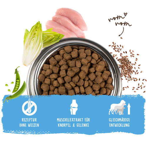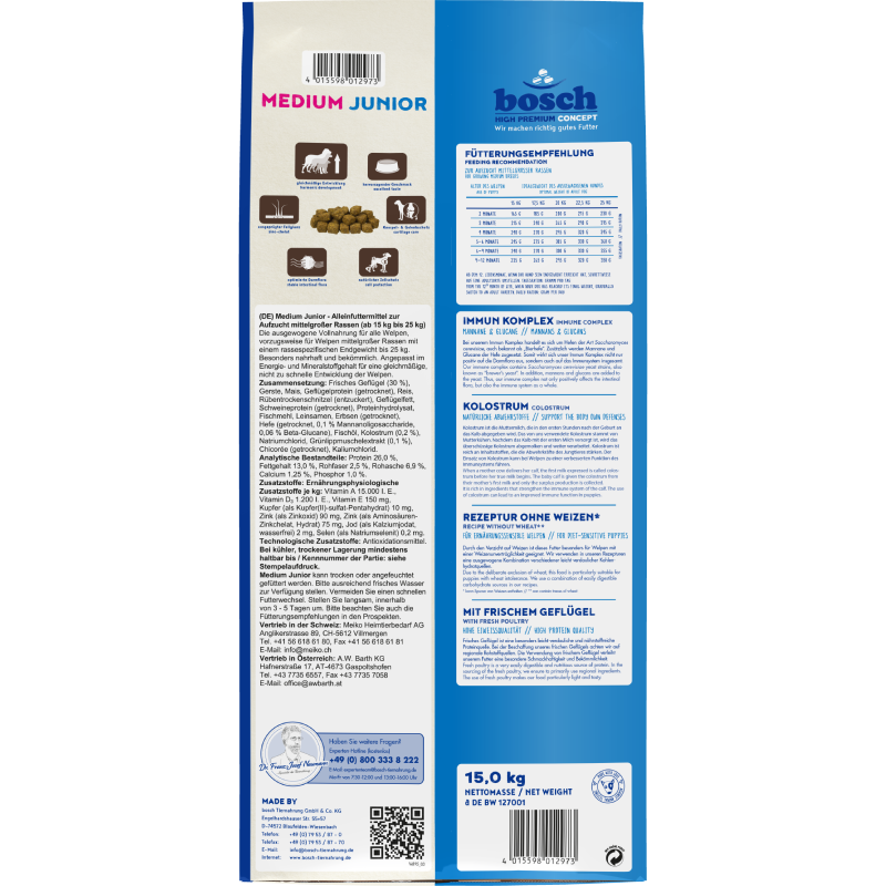 MEDIUM JUNIOR wird ohne Weizen, mit viel frischem Geflügel (min. 30 %) hergestellt.
