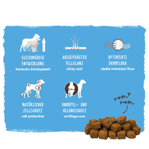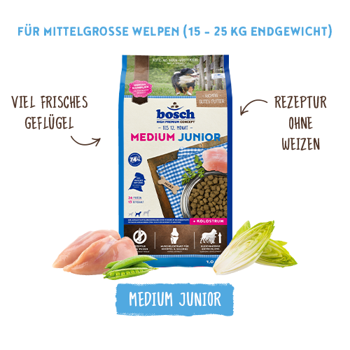MEDIUM JUNIOR eignet sich besonders für die Aufzucht mittelgroßer Hunde im Gewichtsbereich von 15 – 25 kg für eine gleichmäßige, nicht zu schnelle Entwicklung.