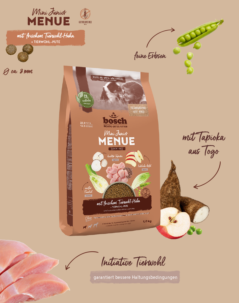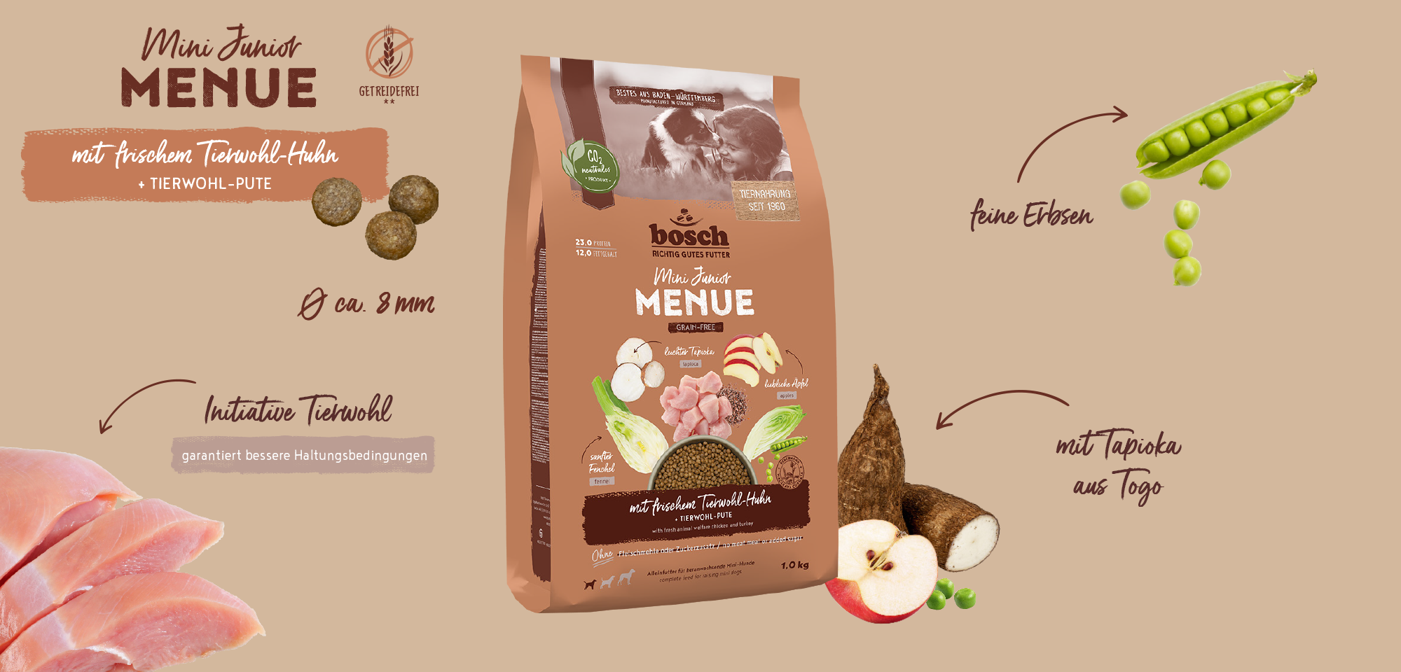 Für welche Hunde ist das bosch HPC MENUE Mini Junior Tierwohl-Huhn geeignet?