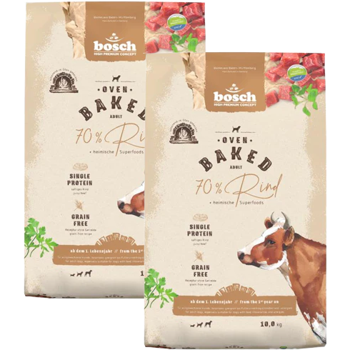 Oven baked Rind enthält mit 70 % Rind, davon 62 % als frisches Rind nur eine tierische Eiweißquelle (single Protein) und wird ohne Getreide hergestellt.