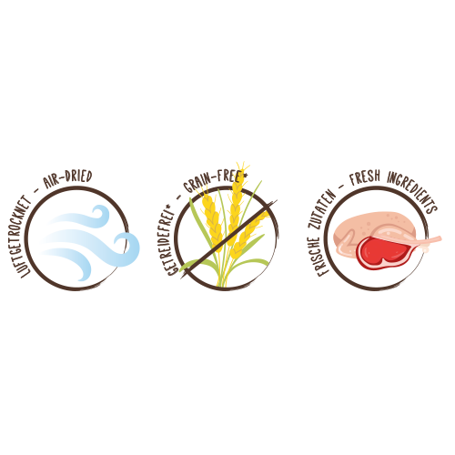 Die erlesenen Zutaten dieses köstlichen Fleischsnacks werden schonend luftgetrocknet und behutsam verpackt. Ein köstlicher Leckerbissen, ohne Zusatz von Getreide - fast wie hausgemacht.