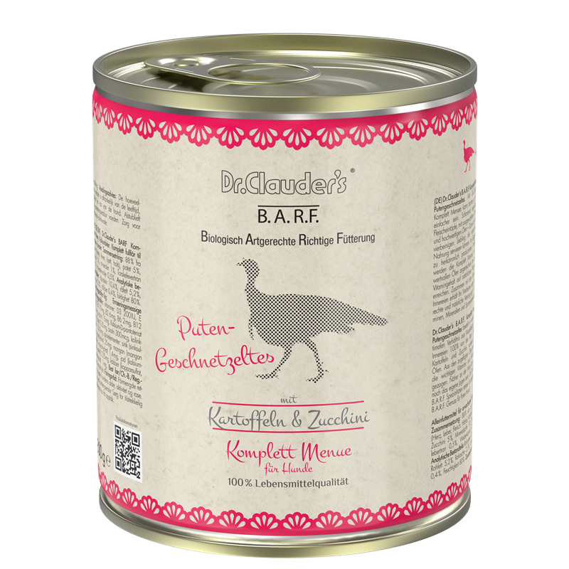 Dr.Clauder's Komplett Menü Hühnerfrikassee besteht in einem optimalen Verhältnis aus Muskelfleisch und Innereien. 100% vom Huhn - dazu Karotten, SüßKartoffeln, Spargel und Amaranth. Aus den zugefügten Ölen werden die wichtigen Vitamine und Fettsäuren gezogen. Näher an der Natur kann nur noch das eigene Jagen sein. Aufgrund der Single-Protein Rezeptur ist dieses Produkt auch für Allergiker geeignet. Dr.Clauder's B.A.R.F. Spezialitäten stehen für den puren Genuss für Ihren Hund.