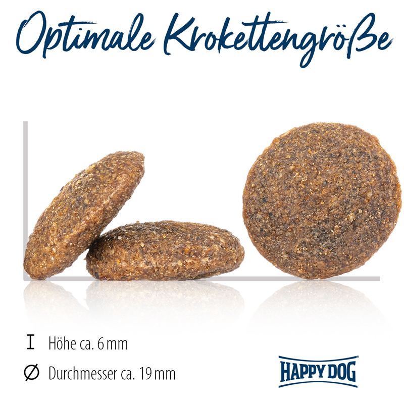 Dieses Futter ist perfekt für mittelgroße und große Hunde. Kleine Hunde greifen besser zum Happy Dog Sensible Mini France.