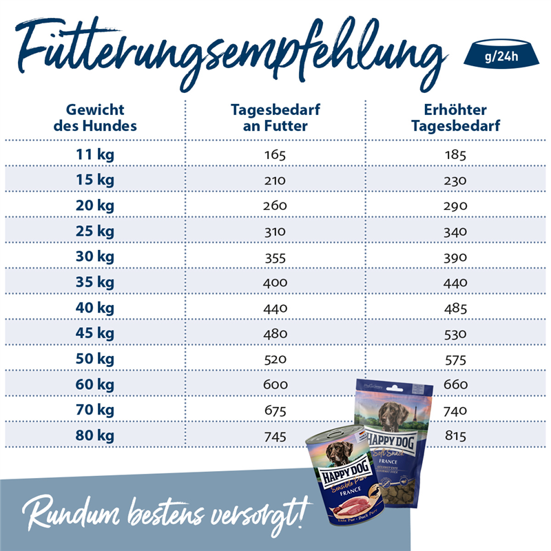 Bei zusätzlicher Gabe von Snacks oder anderen Zusatzprodukten ist die Futtermenge zu reduzieren. Aufgrund individueller Stoffwechselunterschiede der Hunde kann die angegebene Menge des Normalbedarfs bei Veranlagung zu Übergewicht um bis zu 15 % gekürzt werden.