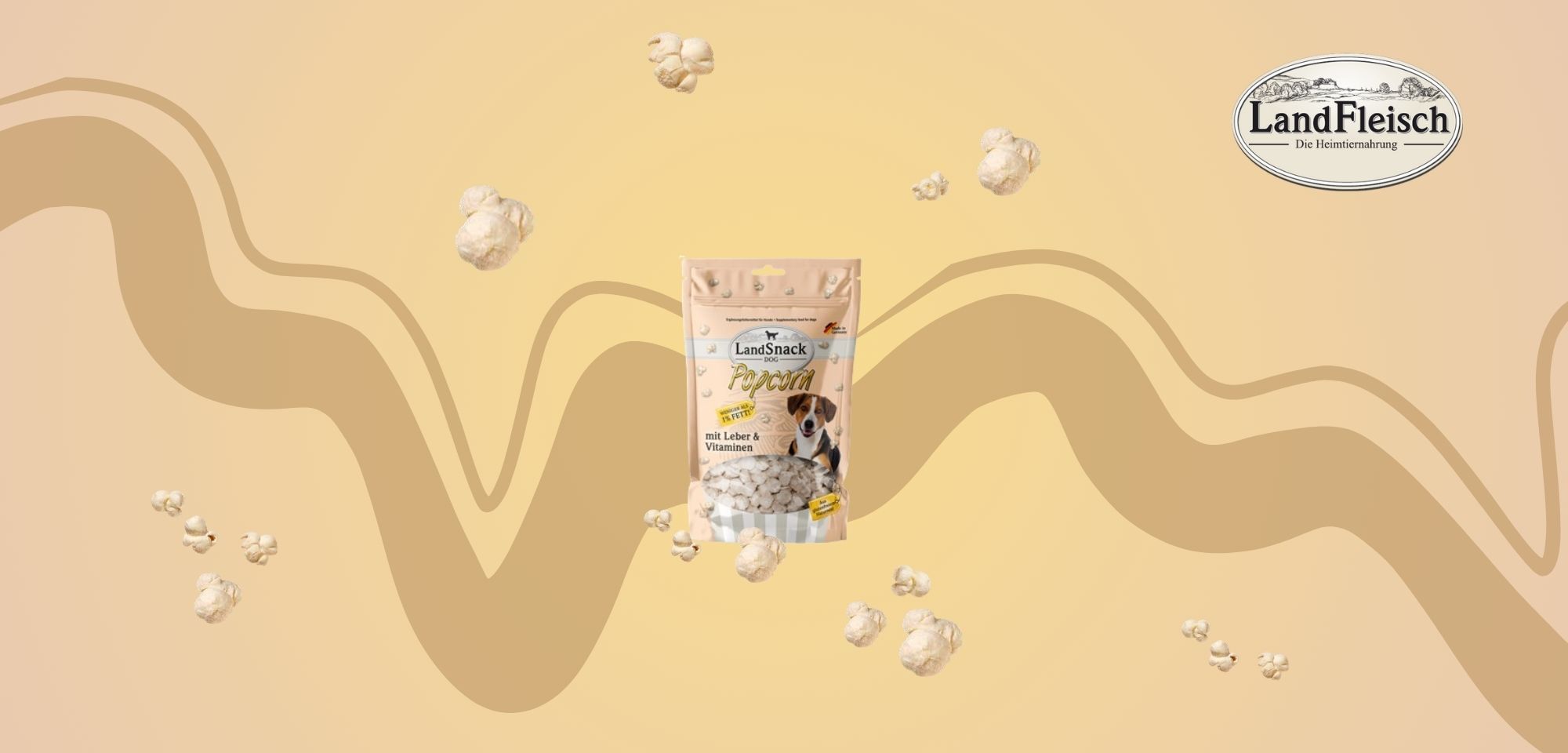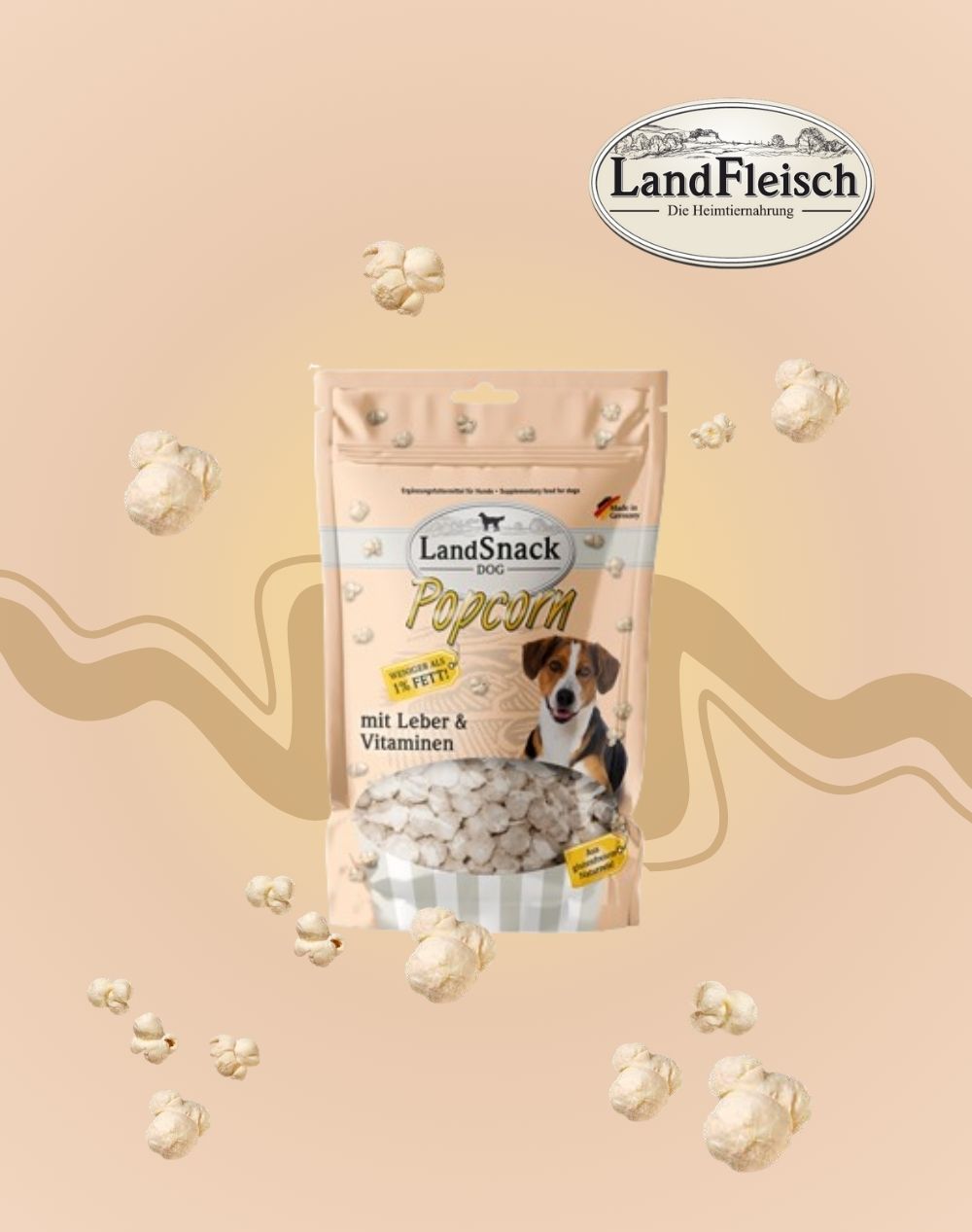 Das LandSnack Dog Popcorn mit Leber und Vitaminen ist ein zuckerfreies Ergänzungsfuttermittel für alle Hunde. Die besonders leichten Snacks haben einen Fettanteil von weniger als 1 %, enthalten keinen Zucker sowie keine Farb- und Konservierungsstoffe.