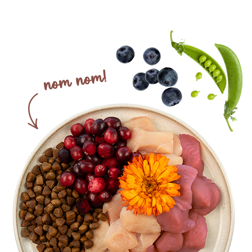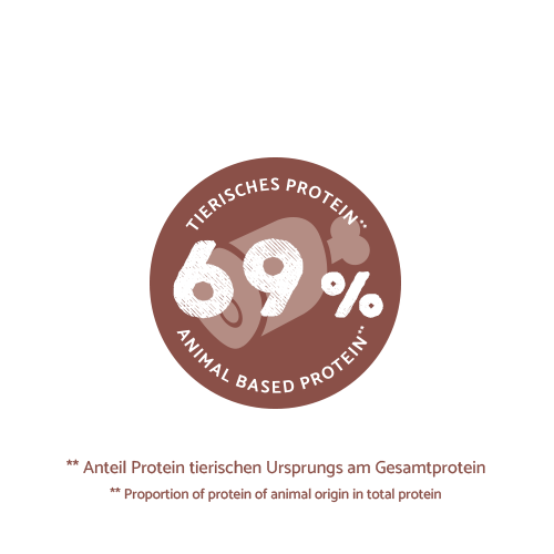 Frisches Hühnchenfleisch (20 %), Gerste, Mais, Geflügelprotein (getrocknet), Grieben (getrocknet), Maisprotein, frisches Perlhuhn (5 %), Erbsenfasern, Proteinhydrolysat, Rübentrockenschnitzel (entzuckert), Tierfett, Reis (1 %), Lebermehl, Lachsöl (0,5 %), Calciumcarbonat, Erbsen (getrocknet, 0,4 %), Kaliumchlorid, Preiselbeeren (getrocknet, 0,1 %), Blaubeeren (getrocknet, 0,1%), Petersilie (getrocknet, 0,1 %), Hefe (getrocknet, 0,1 %), Ringelblumenblüten (getrocknet, 0,05 %).