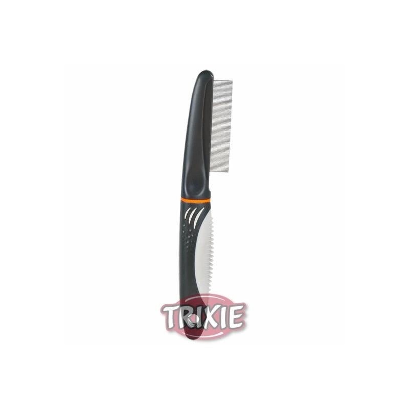 Dieser Floh und Läusekamm hat abgerundete Metallzinken und einen Kunststoffgriff mit rutschfester Gummieinlage.Hinweis:Flöhe sind ein ernst zu nehmendes tiermedizinisches Problem und können die Gesundheit und das Wohlbefinden des Tieres erheblich beeinträchtigen.Um die kleinen Parasiten aufzuspüren, sollte das Tier regelmäßig am besten mit einem Flohkamm gründlich auf einer hellen Unterlage wie z. B. einem Stück Küchenrolle, durchgekämmt werden. So kann bei Entdeckung eines Flohbefalls unmittelbar reagiert und die Bekämpfung begonnen werden. Neben ausgewachsenen Flöhen weisen Floheier, die wie kleine weiße Körnchen aussehen oder auch die Ausscheidungen von Flöhen kleine schwarze Körnchen, die bei Wasserkontakt einen roten Fleck ergeben auf einen Flohbefall hin.