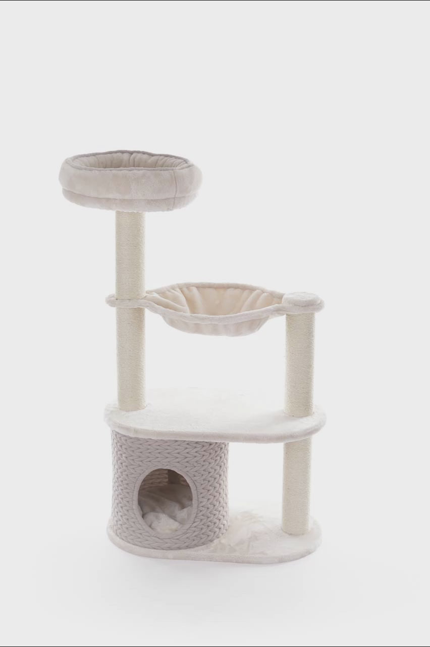 Kratzbaum mit gepolsterten Liegeplatten mit abnehmbarem Kuschelbett.