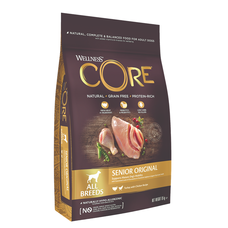 Wellness CORE Senior Truthahn mit Huhn ist ein Alleinfuttermittel für ausgewachsene Hunde.