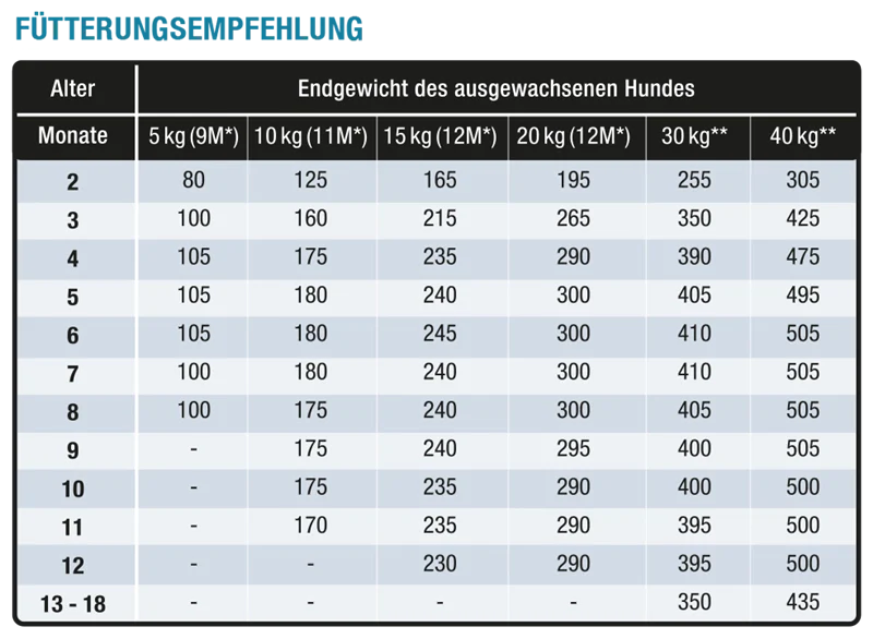 Diese Angaben sind Richtwerte. Der individuelle Bedarf hängt von Faktoren wie Alter, Rasse, Aktivität und Haltungsbedingungen ab. Bitte stets frisches Wasser bereitstellen. Ab dem (* Lebensmonat) / **wenn der Hund sein Endgewicht erreicht hat, bitte auf Futter für ausgewachsene Hunde umstellen. Bitte kühl und trocken lagern. Nicht in der Nähe von Reinigungsmitteln, Arzneimitteln und anderen scharf riechenden Sachen lagern! * Spuren anderen tierischer Proteinquellen können enthalten sein ** Spuren von Getreide können enthalten sein