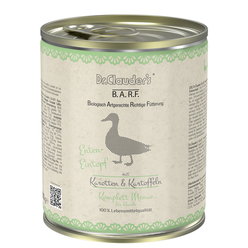 Mit Dr.Clauder's Komplett Menüs kann barfen gar nicht einfacher sein. Schonend eingekochte Fleischeintöpfe, mit ausgewähltem Gemüse und hochwertigen Ölen. Im Gegensatz zu herkömmlich produzierten Produkten werden die Komplett Menüs nur mit wertvollen Ölen angereichert, um so den Vitamingehalt auf natürlichem Wege zu erreichen. Zusammen mit dem Anteil an Innereien erhält Ihr Vierbeiner eine artgerechte und natürliche Versorgung mit Vitaminen, Mineralien und Spurenelementen. Dr.Clauder's Komplett Menü "Enteneintopf" besteht in einem optimalen Verhältnis aus Muskelfleisch und Innereien 100% von der Ente - dazu Karotten und Kartoffeln, verfeinert mit Ölen. Aus den zugefügten Ölen werden die wichtigen Vitamine und Fettsäuren gezogen. Näher an der Natur kann nur noch das eigene Jagen sein. Dr.Clauder's BARF Spezialitäten stehen für den puren BARF Genuss für Ihren Hund.
