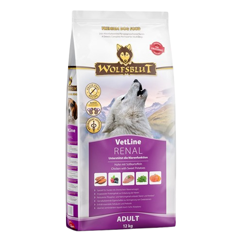 WOLFSBLUT VetLine RENAL ist ein Diät-Alleinfuttermittel für ausgewachsene Hunde zur Unterstützung der Nierenfunktion bei chronischer Niereninsuffizienz und zur Verringerung der Oxalatsteinbildung.